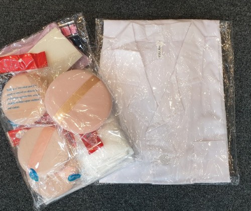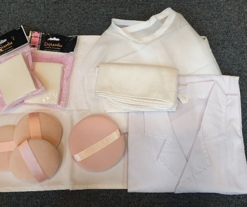 위생복, 테이블보, 앞가리개, 헤어밴드, 퍼프(3개), 왕퍼프(1개), 8pcs라텍스 스펀지(2개)로 구성되어 있습니다.