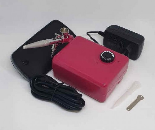 컴프레셔, 에어호스, 어댑터, 에어브러쉬 건 등으로 구성되어 있습니다.